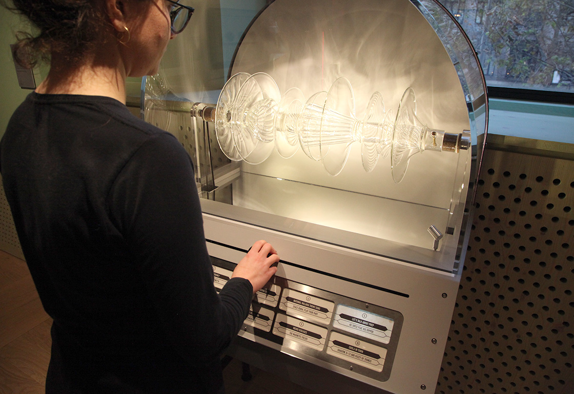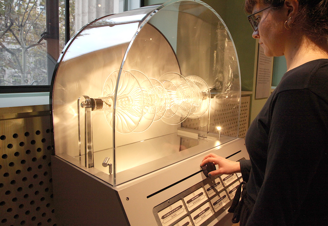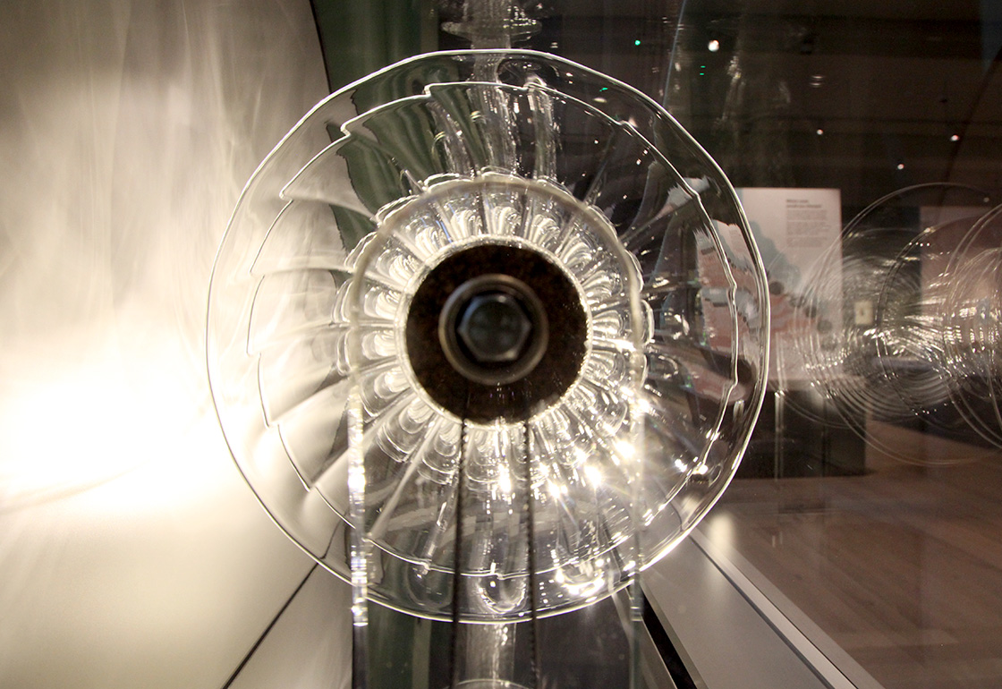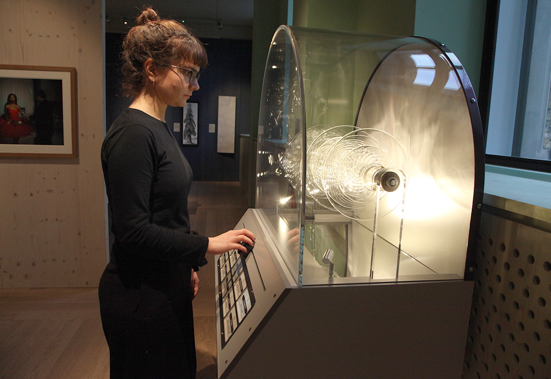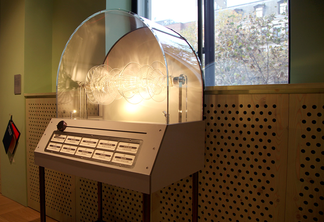 We wanted the installation’s form to hark back to that of a classic jukebox, with its curved glass top and panel display of song titles, but also for it to compliment Bethan’s glass artwork housed inside. The artwork itself slowly rotates, with its many layered discs mimicking that of a stack of vinyl records. The visitor slides a controller to move through the tracks, which cross-face into each other, illuminating their name and song title as they are selected. A laser line moves across the glass artwork, refracting as it follows the contours of its form. Lights inside the unit reflect across the piece, casting moving reflections and shadows across the walls. The music is played through localised pod speakers above the installation, creating an immersive audio experience.