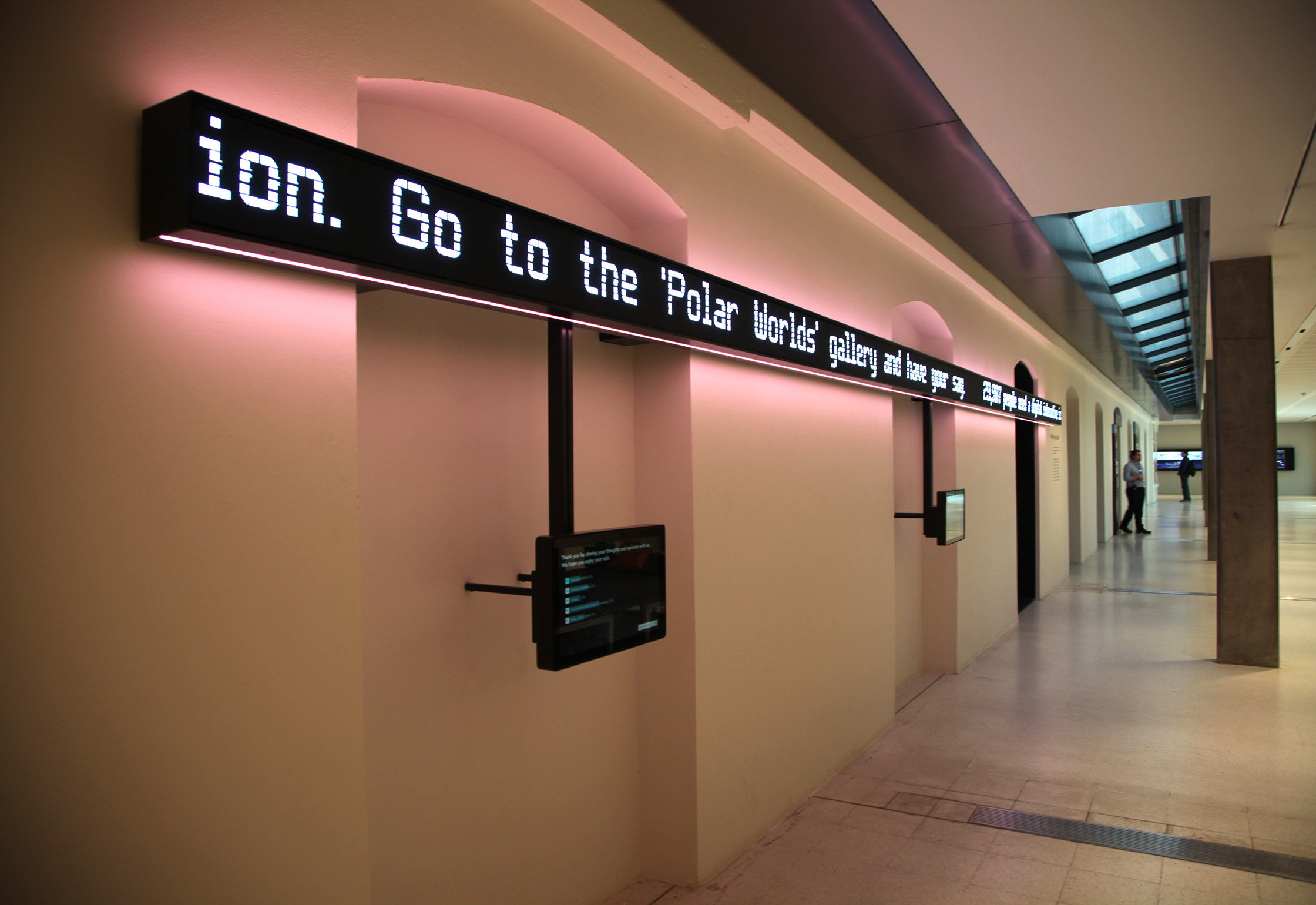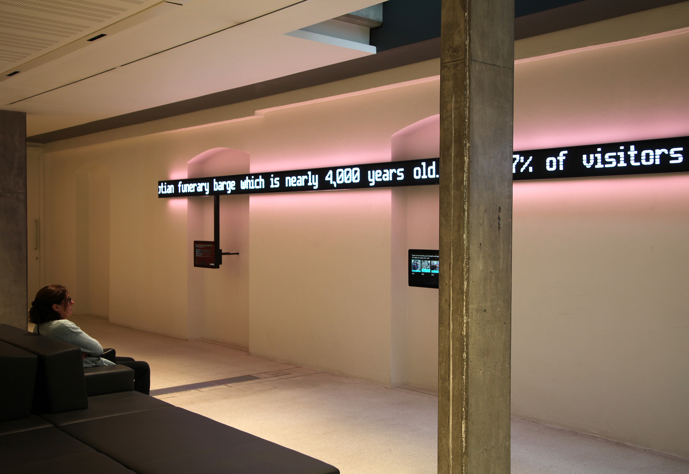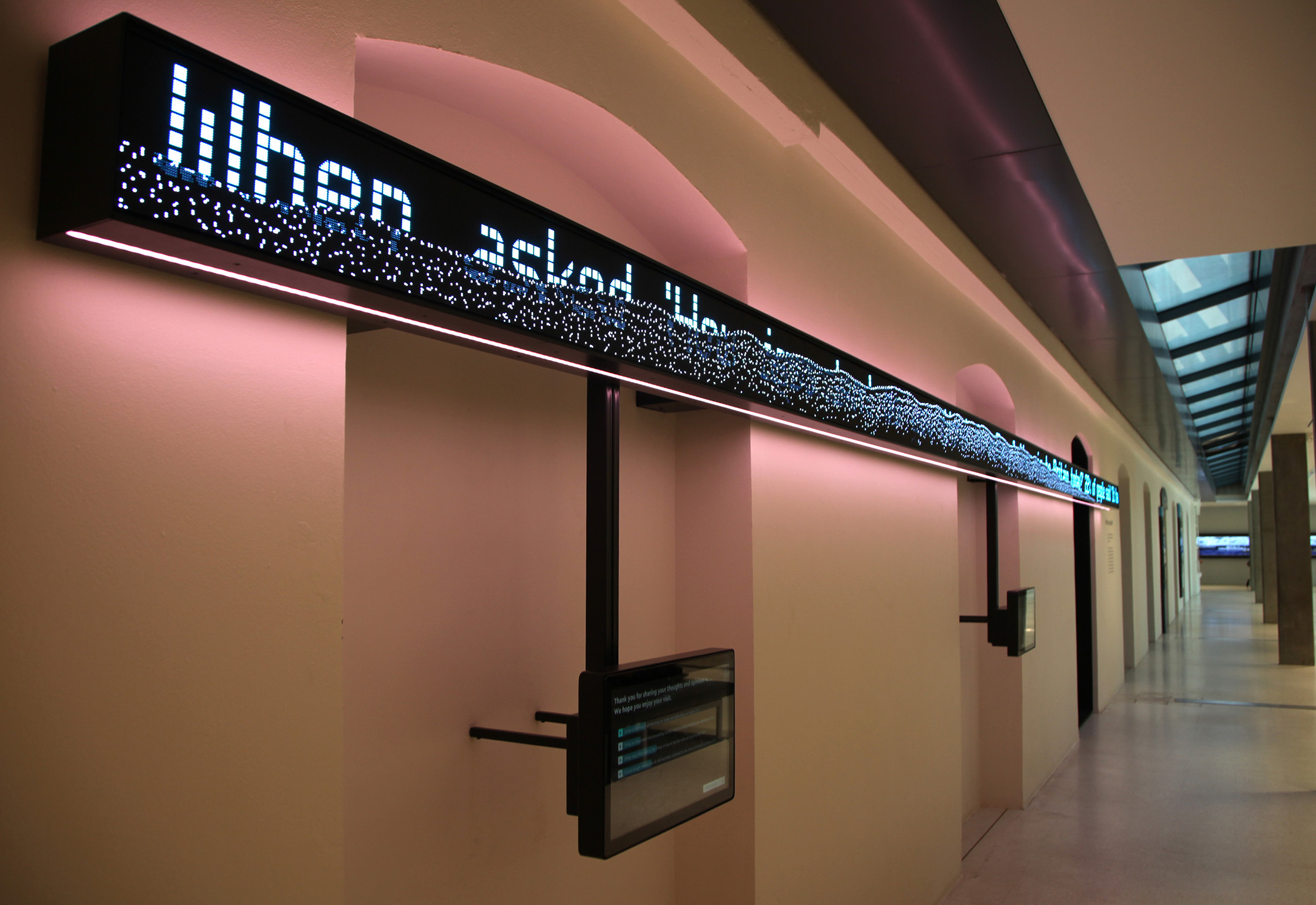 The interactive installation consists of a ten metre long LED “ticker” screen, running the length of the entrance wall of the Sammy Ofer wing. Fascinating facts and statistics about the museum scroll across the screen, in a Times Square news headline style. Generative wave animations that are triggered every time a visitor submits an answer via the touch screens below. The software randomly selected a series of questions, displaying the overall results in bar charts and percentages. DMX controlled LED lights surround the ticker screen, and are triggered to change colour when the visitor submits and answer. The ticker also brings in stats from various other interactives around the museum that are connected to the museum’s Re:Think database.