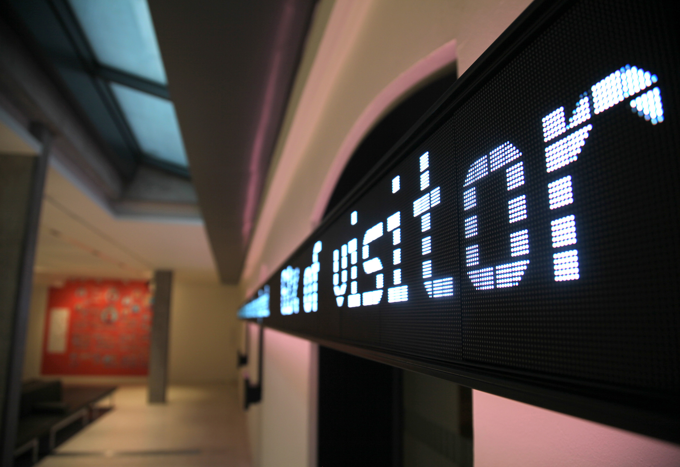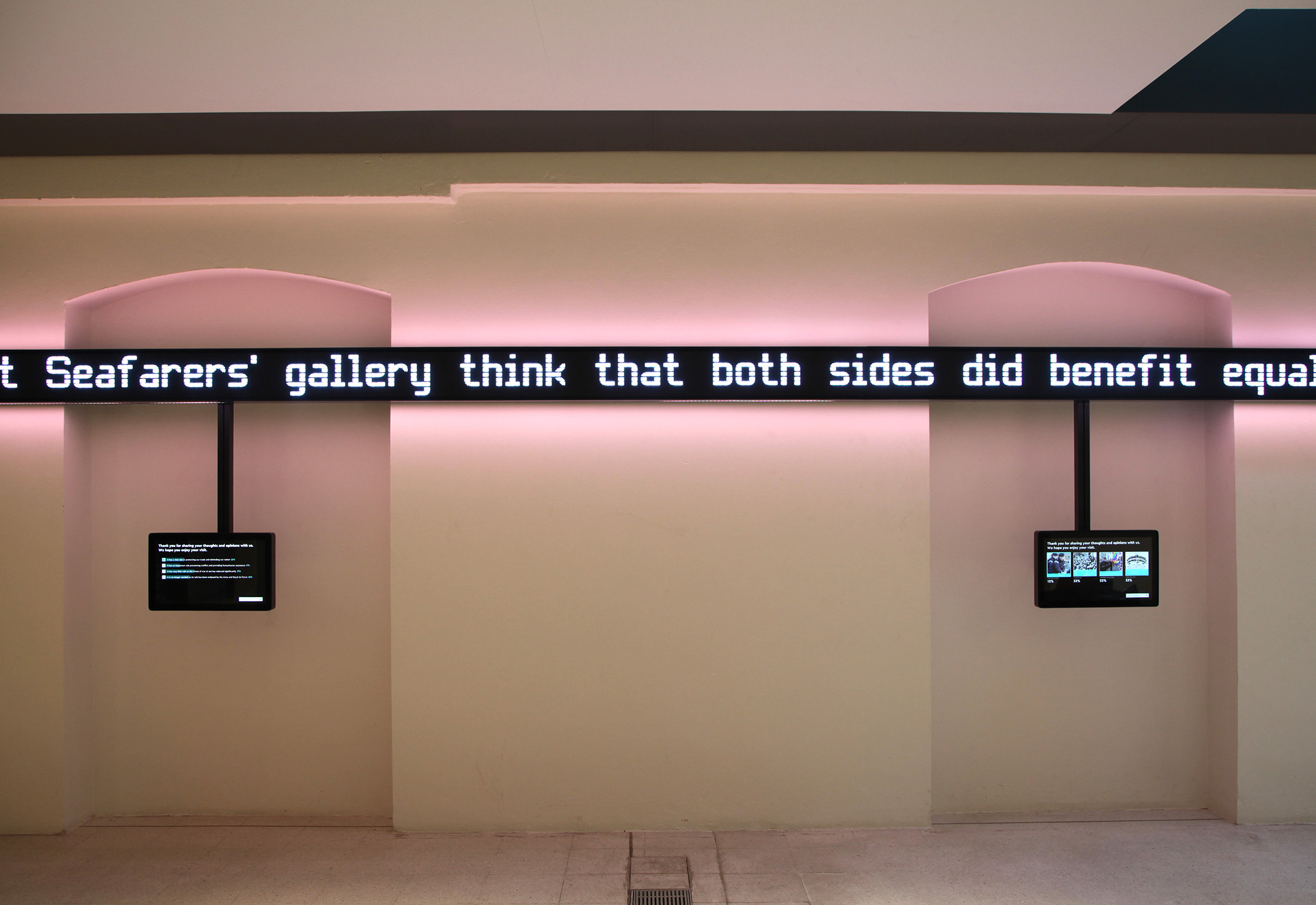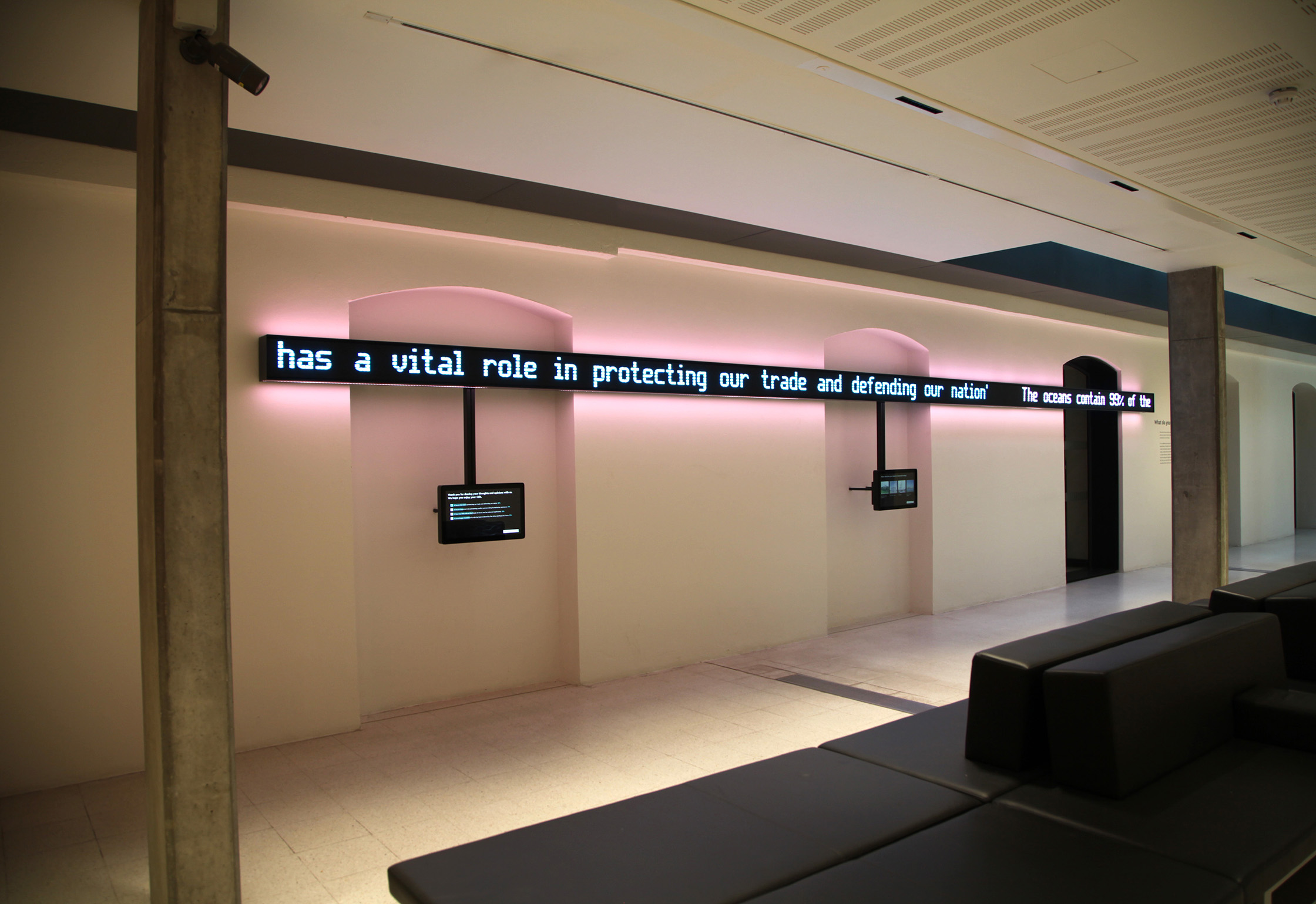 The interactive installation consists of a ten metre long LED “ticker” screen, running the length of the entrance wall of the Sammy Ofer wing. Fascinating facts and statistics about the museum scroll across the screen, in a Times Square news headline style. Generative wave animations that are triggered every time a visitor submits an answer via the touch screens below. The software randomly selected a series of questions, displaying the overall results in bar charts and percentages. DMX controlled LED lights surround the ticker screen, and are triggered to change colour when the visitor submits and answer. The ticker also brings in stats from various other interactives around the museum that are connected to the museum’s Re:Think database.