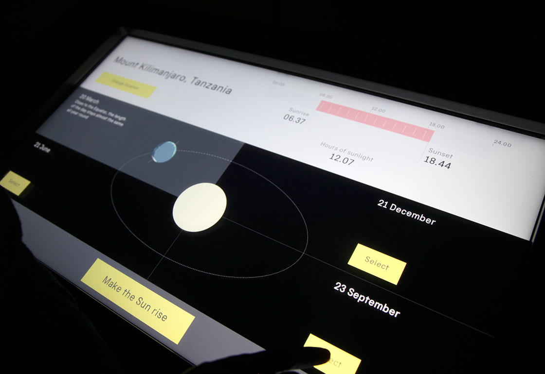 We were asked to create a key interactive for the Science Museum’s blockbuster exhibition, The Sun – Living With Our Star. The exhibit needed to show visitors how the Sun’s movements varied depending on where in the world they were located and at what time of year.