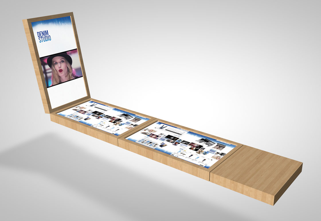 Fashion photography and videos flow down the centre of the table, and can be dragged, scaled, and pushed to a large vertical display screen. Tabs along the edge of the table allow customers to browse and filter through all the styles and watch animated videos containing helpful denim tips to flatter their shape. They can also create their own wish lists, which they can then email and click to purchase online afterwards, and also print out a mini booklet in store to take away.